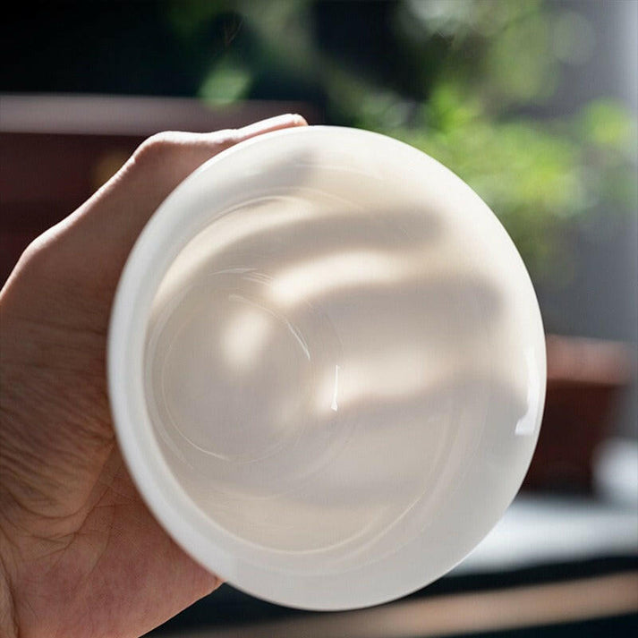 玉瓷蓋碗質地細膩緻密,採用上等高嶺瓷土羊脂玉製成,1380度高溫窯燒、高潔瑩潤、玉質雪肌。具有超常的透明度和光澤度,手感溫潤,能使泡茶香氣更顯,使您沉浸在茶的芳香中悠閒享受美好時光。