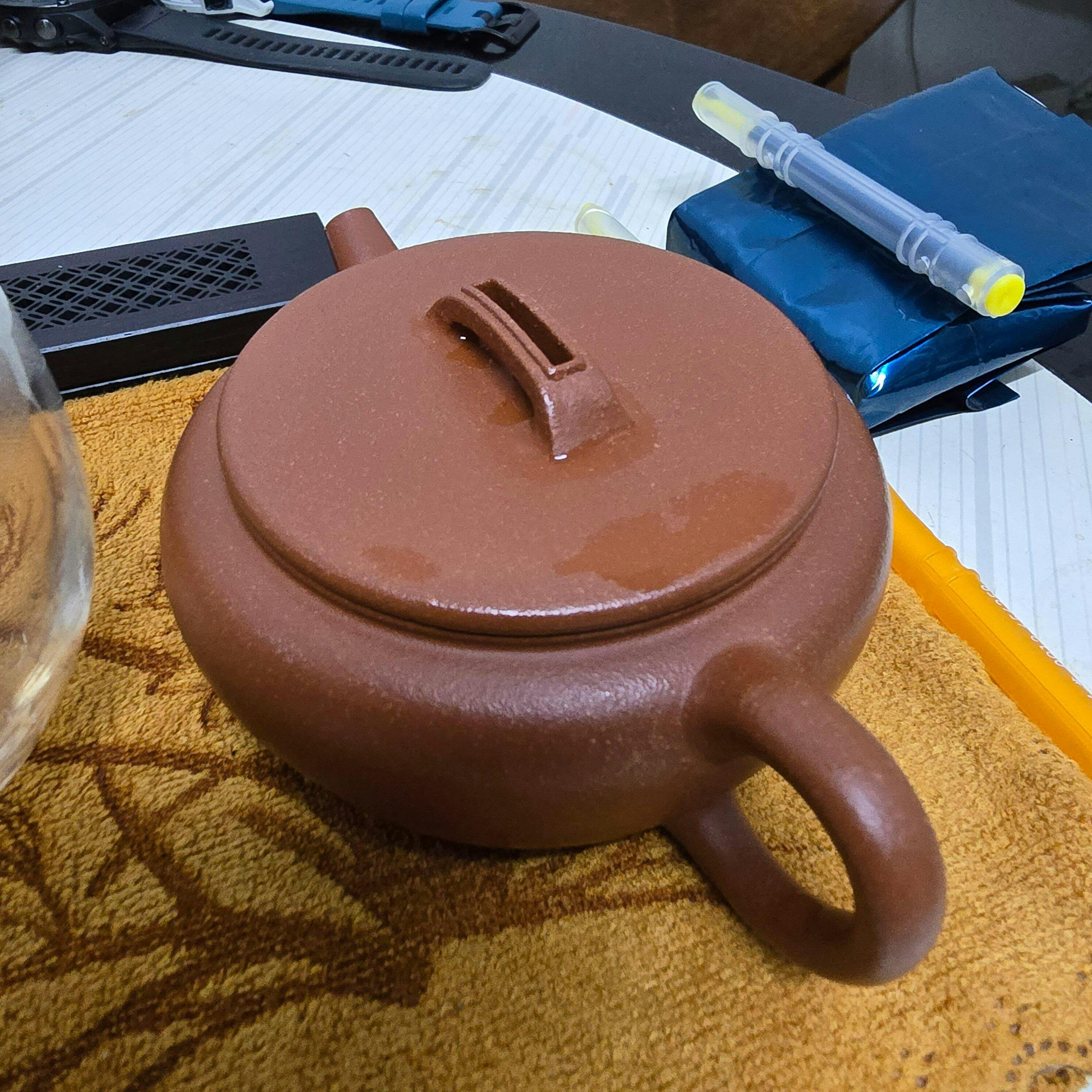 茶壺的外觀古樸端雅。 壺身扁圓,壺間飽滿,茶壺蓋壺口子母線吻合,大口的蓋子設計,這樣在置茶葉及清理茶渣時更方便,大平底,直流的壺嘴出水順暢,壺蓋樑鈕拿捏方便。 是一款經典的好用壺款。